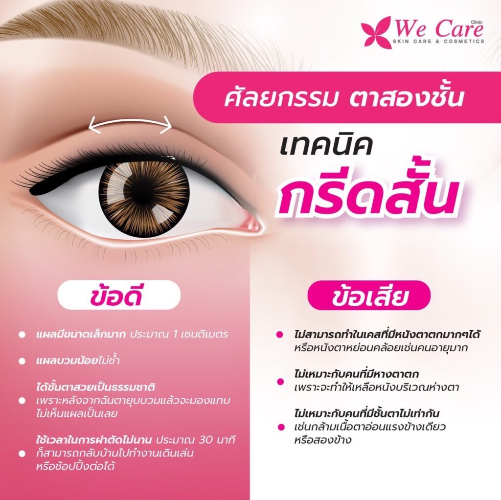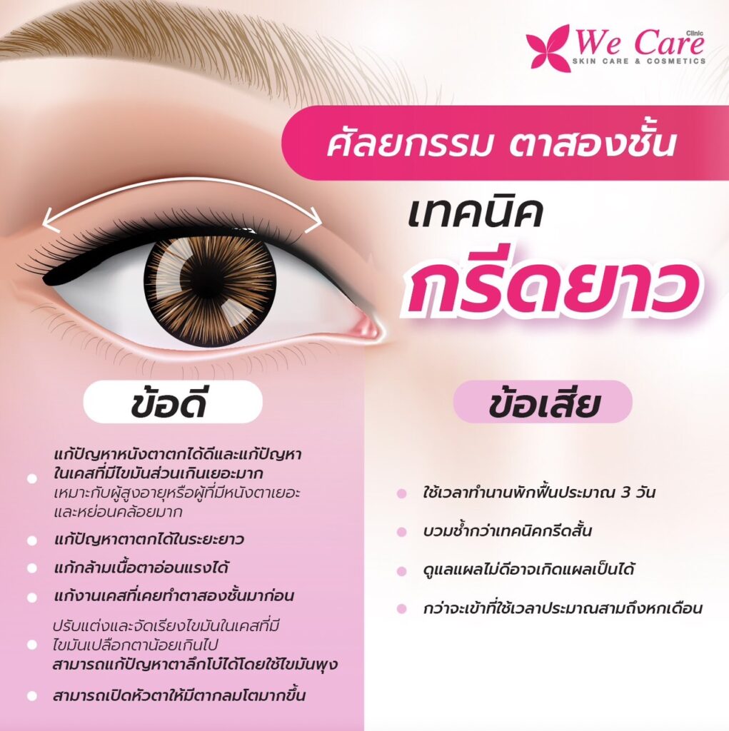 ปัจจุบันปัจจุบันศัลยกรรมตาสองชั้นมีหลายเทคนิคแต่วีแคร์คลินิกจะนำเสนอสองเทคนิคที่กำลังนิยมอยู่ในขณะนี้คือ เทคนิคกรีดสั้นและ เทคนิคกรีดยาว